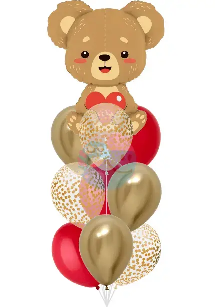 Шары закреплены на утяжелителе — при необходимости их можно распустить под потолок. Фонтан «Мишка» доставим в защитном пакете (сохранит чистоту и обережет от влаги при перевозке).