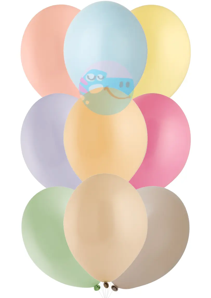 Микс шаров макарунс привезем уже в надутом виде на лентах закрученных в «серпантин».